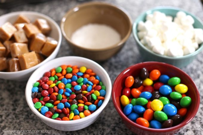 These candy bar bites are so easy to customize to your personal preference. I love M&M’s Peanut Butter, or even a scoop of Peanut Butter Frosting, so I made a bunch with those to keep on hand. For my son, the marshmallows were a huge hit. Even just plain was delicious! I also used some large crystal salt to add a little bit of tangy to the sweet. Yummmy.